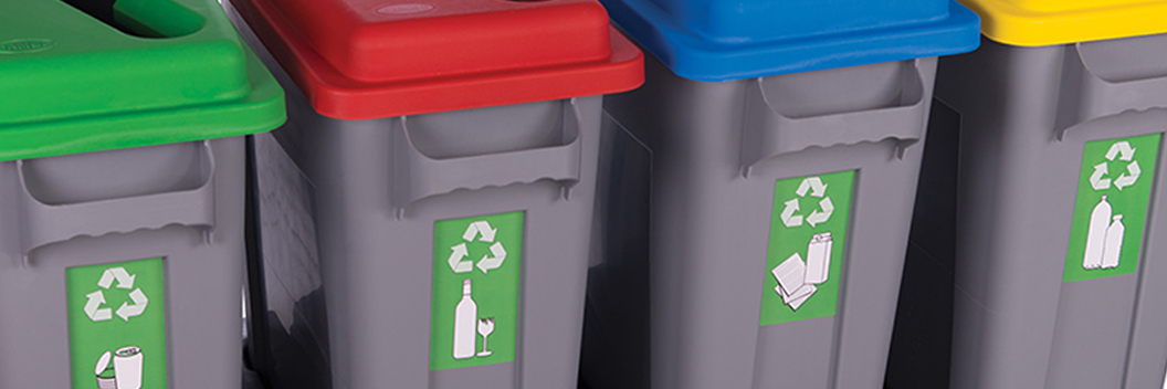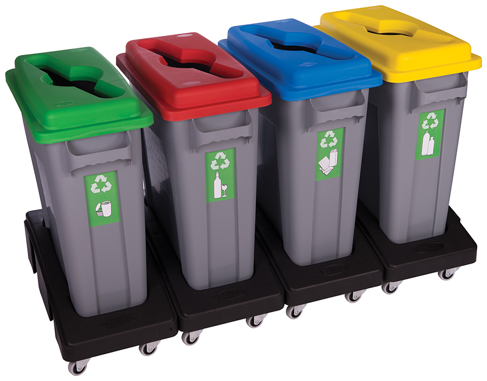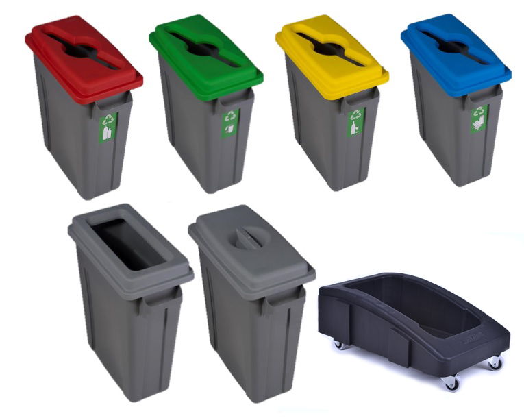 R/BIN von Ertumop ist eine Serie von Entsorgungsgefäßen für feste Abfallstoffe, wie Papier, Kunststoff, Glas und Metall. Verschiedenartige Deckel, die jeweils in den Farben rot, grün, gelb, blau und grau lieferbar sind, erleichtern die korrekte Abfall-trennung. Das System ist so konstruiert, dass bis zu vier verschiedene Behälter auch mit unterschiedlich farbcodierten Deckeln auf einem mobilen Trolley zusammengefasst werden können. Je nach Verwendung können die Gefäße mit auch mit unterschiedlich geformten Deckeln versehen werden. Trolleys sind mit Aufnahmen für einen, zwei, drei oder vier R/BIN-Gefäße lieferbar.