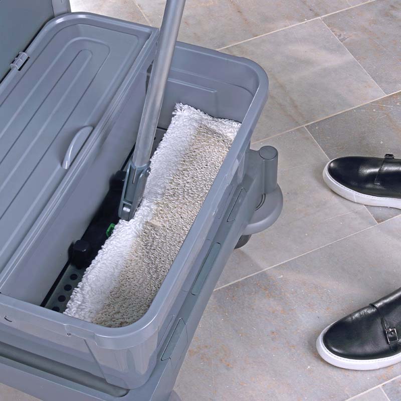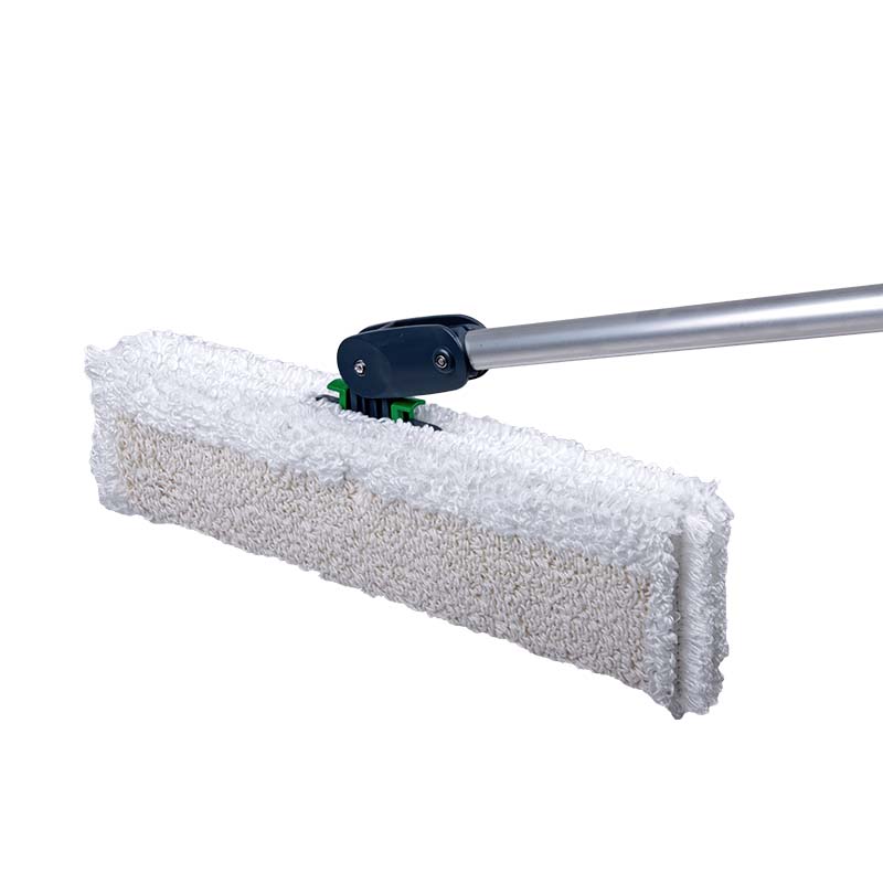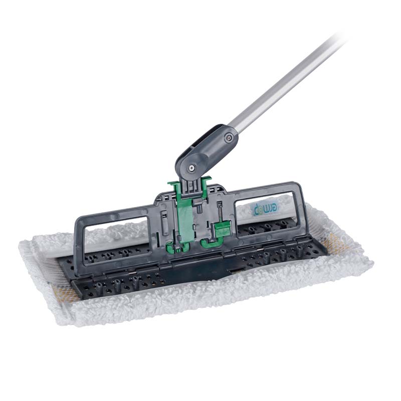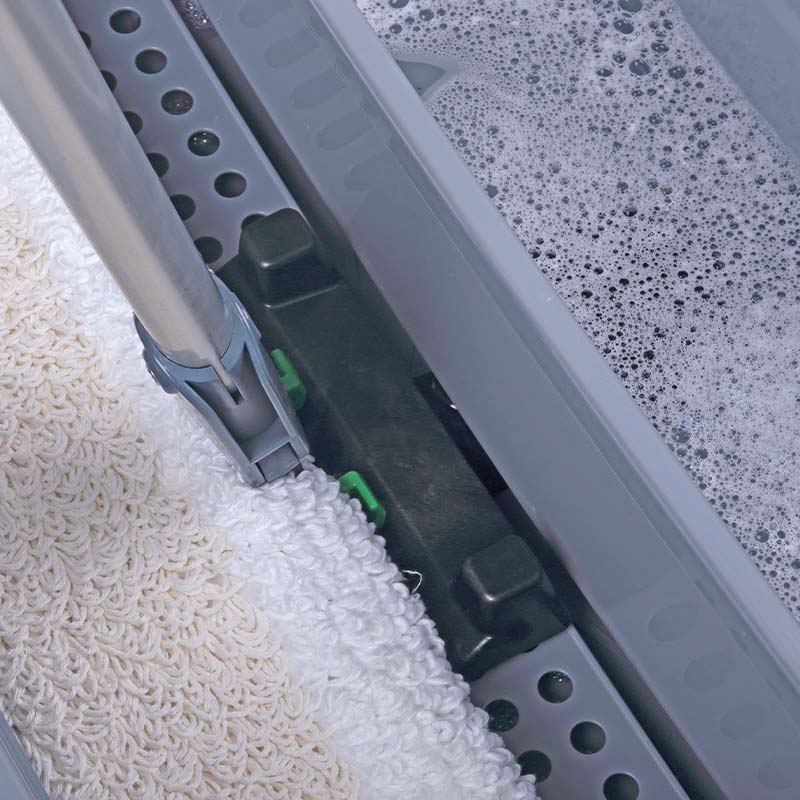 Unser patentiertes Produkt “Wings Mopp” hat einen doppelseitigen Bezug mit einer hohen Aufnahmekapazität für Feuchtigkeit und Schmutz. Seine Struktur aus Schlingen und Fasern ermöglichen eine optimale Schmutzaufnahme und ein besseres Gleiten auf dem Boden und gewährleisten damit eine gründliche professionelle Reinigung.